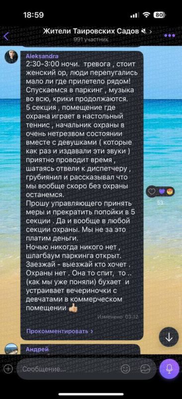 Жители утверждают, что сотрудники охраны, включая начальника, выпивали вместе с молодыми девушками. Начальник охраны, находившийся в состоянии сильного опьянения, с трудом держался на ногах, и его пришлось отвести в диспетчерскую.