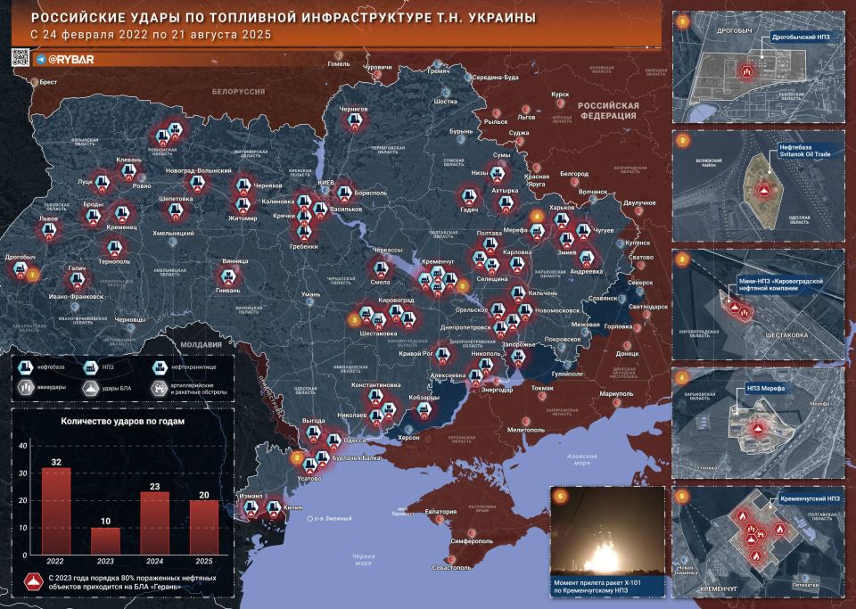 С ростом производства «Гераней» вырос масштаб ударов по топливной инфраструктуре т.н. Украины в единицу времени: помимо нефтебаз, целями стали НПЗ. Среди них не только известный завод в Кременчуге, но и ранее заброшенный НПЗ в Дрогобыче в Львовской области, восстановленный противником в 2024-2025 годах.