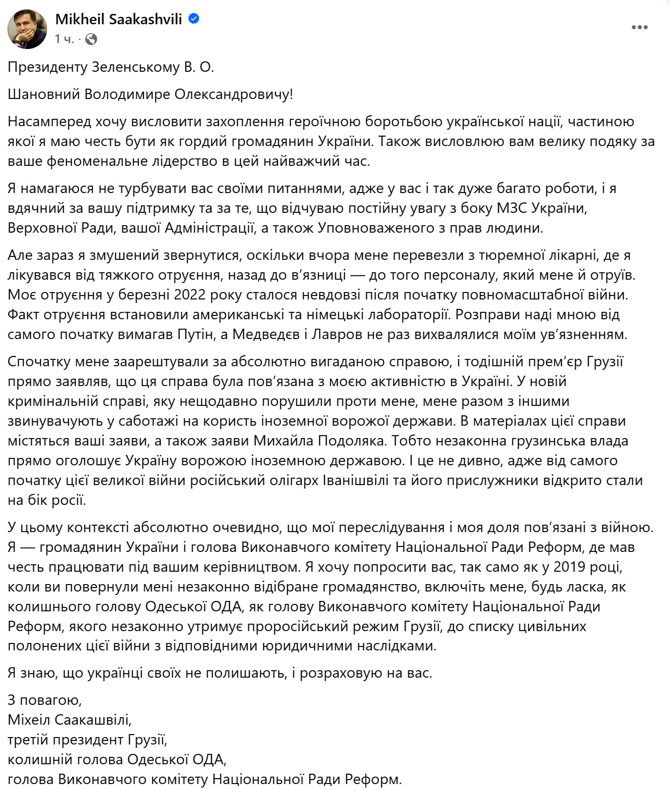 «Я гражданин Украины и председатель исполкома Национального совета реформ, где имел честь работать под вашим руководством. Хочу попросить вас, как и в 2019 году, когда вы вернули мне незаконно взятое гражданство, включите меня в качестве бывшего председателя Одесской ОГА и председателя исполкома Национального совета реформ, незаконно удерживаемого пророссийским режимом Грузии, в список военнопленных этой войны с соответствующими правовыми последствиями», — написал Саакашвили.