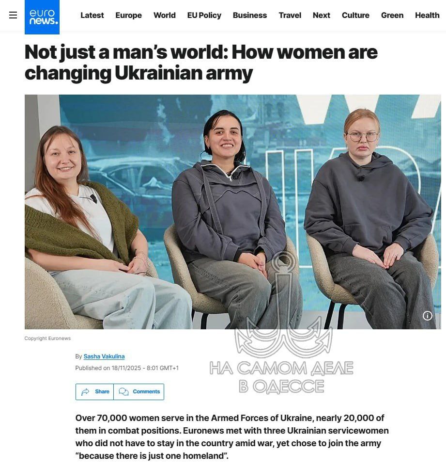 Euronews рапортует о 70 тысячах женщин в ВСУ, 20 тысяч из которых воюют. И обещает, что их будет еще больше. Статья гордо озаглавлена: «Мир, принадлежащий не только мужчинам».
