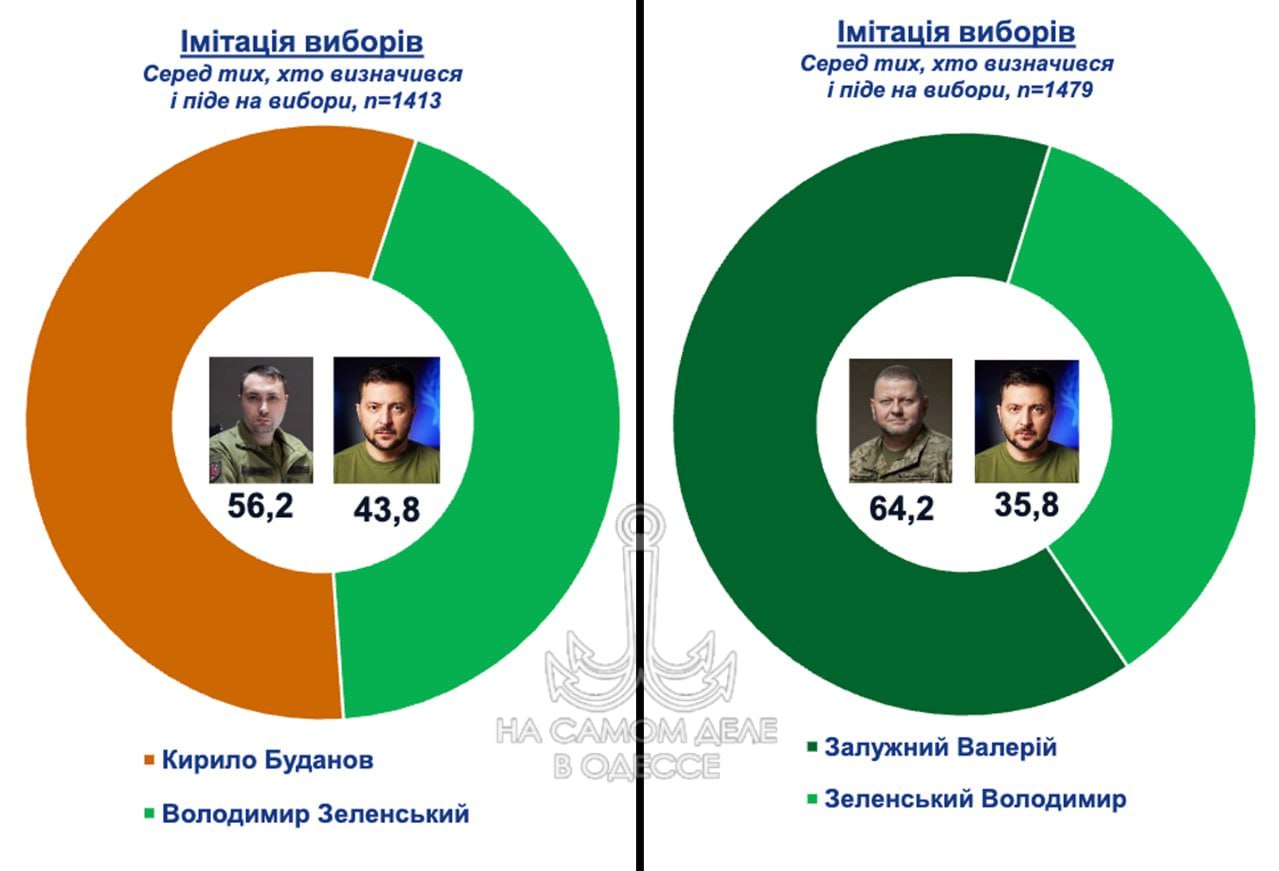 Украинский центр социальных исследований SOCIS смоделировал вероятные исходы выборов, если они таки случатся. Моделирование проводилось с учётом того, как если бы на должность президента Незалёжной баллотировался Зеленский и начальник ГУР Кирилл Буданов (первая модель выборов) либо экс-главком Валерий Залужный (вторая модель выборов).