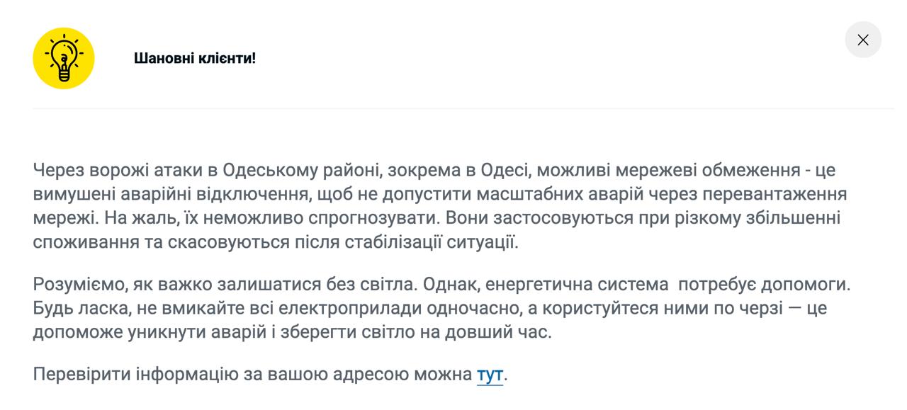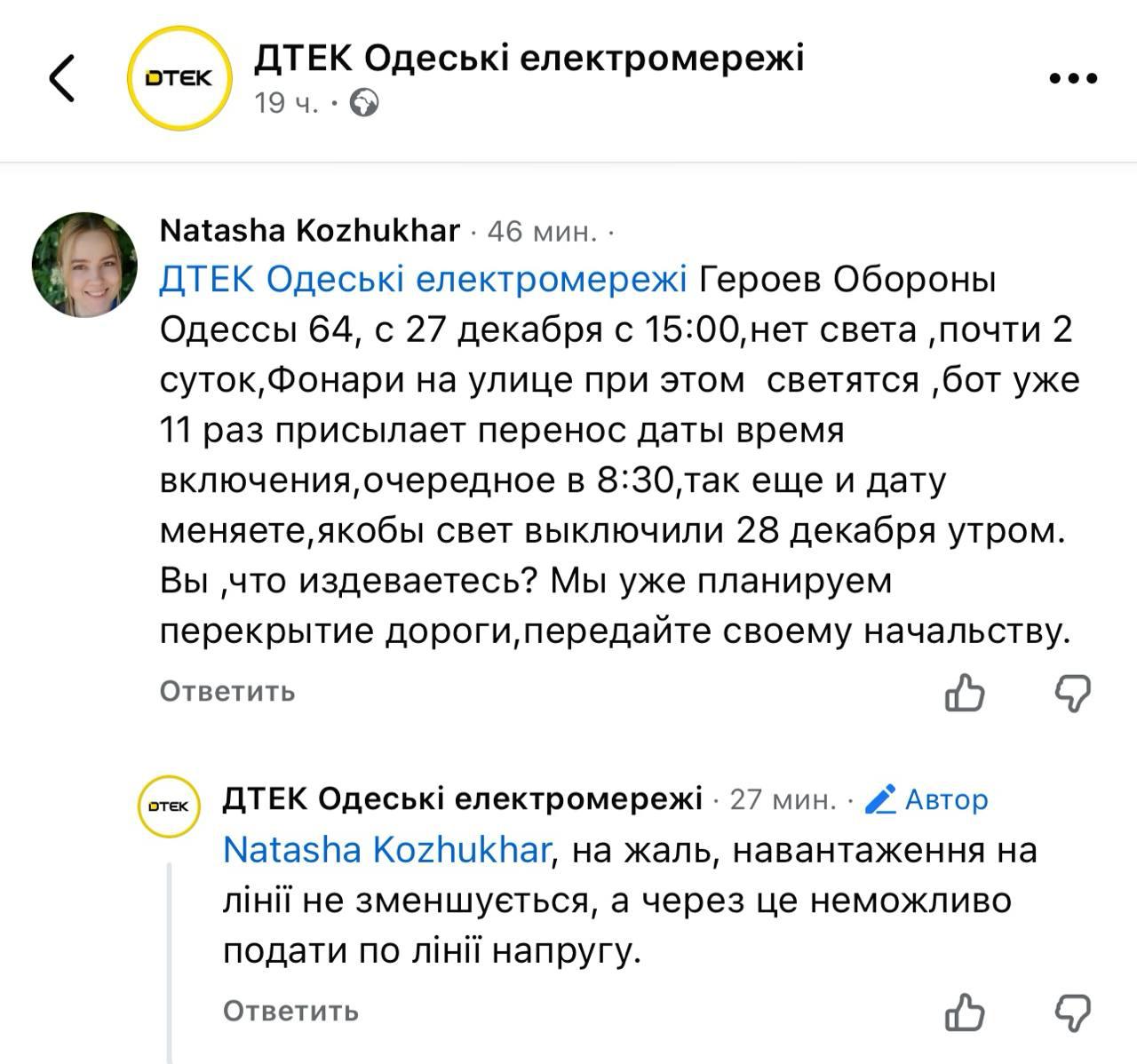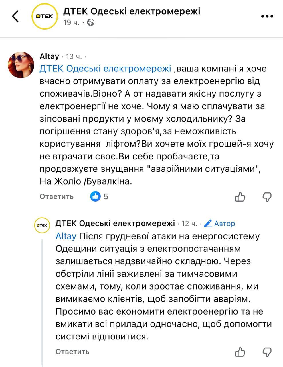В городе продолжаются аварийные отключения электроэнергии, а ситуацию, как признаёт ДТЭК, прогнозировать невозможно. Конкретных сроков восстановления нет - о чем жители пишут на сайте компании.