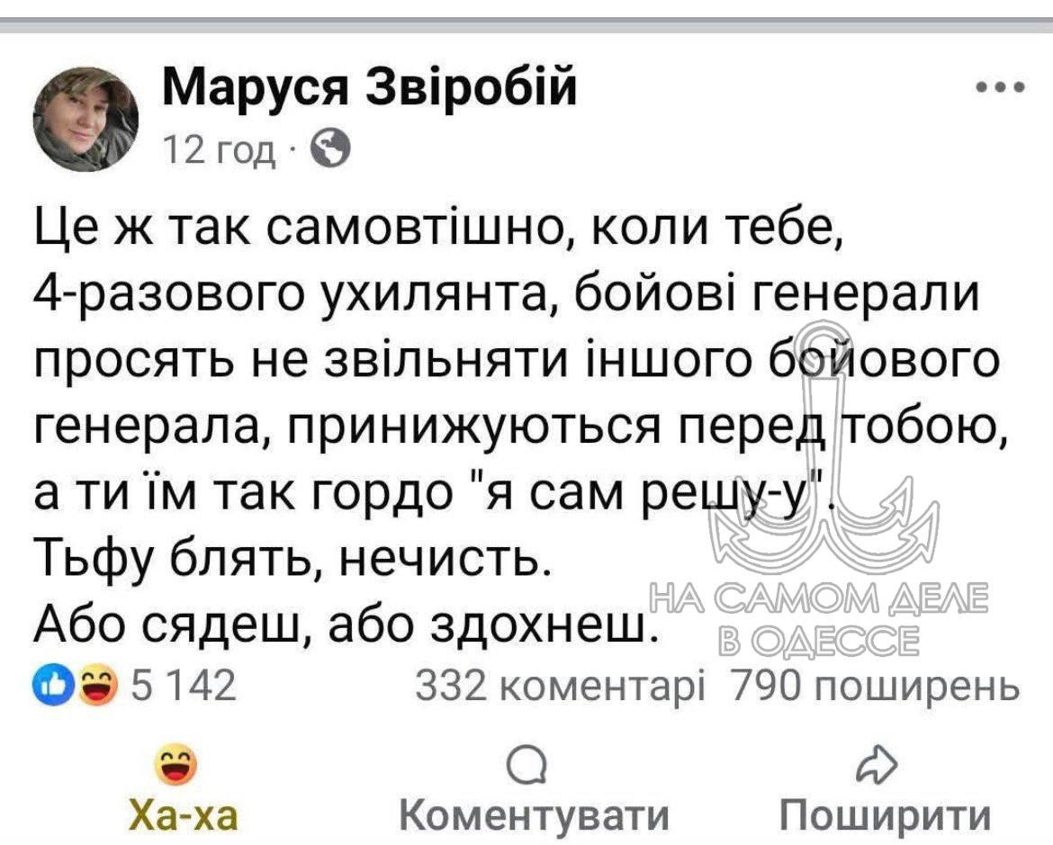 ВСУчка Звиробий заявила в своих соцсетях: «Зеленский либо сядет, либо сдохнет»