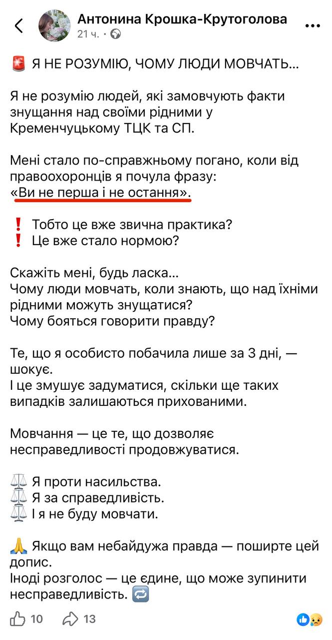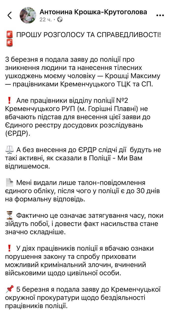 3 марта женщина подала заявление в полицию об исчезновении человека и нанесении телесных повреждений работниками Кременчугского ТЦК и СП, но работники отдела полиции №2 Кременчугского РУП (г. Горишние Плавни) не видят оснований для внесения этого заявления в Единый реестр досудебных расследований (ЕРДР). А без внесения в ЕРДР никакие следственные действия производиться не будут.