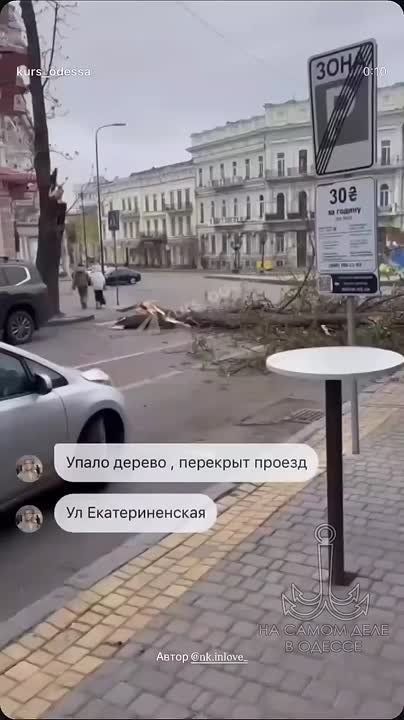 На Екатерининской площади упало дерево и перекрыло дорогу. Сегодня в Одессе — день древесных осадков.