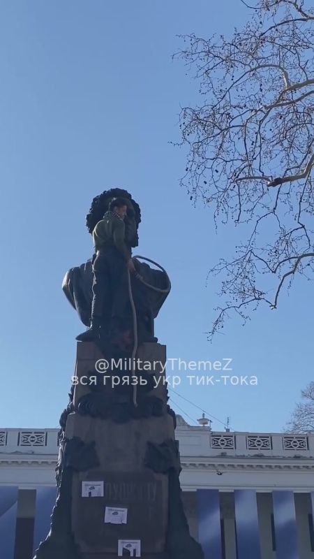 На памятник Пушкину в Одессе ущербные националистынабросило петлю и повесили объявление «Ищу бульдозер». Возмущённые прохожие задали убогим вандалам вопрос о том, что "других проблем нет", на что им ответили: почему не на мове?