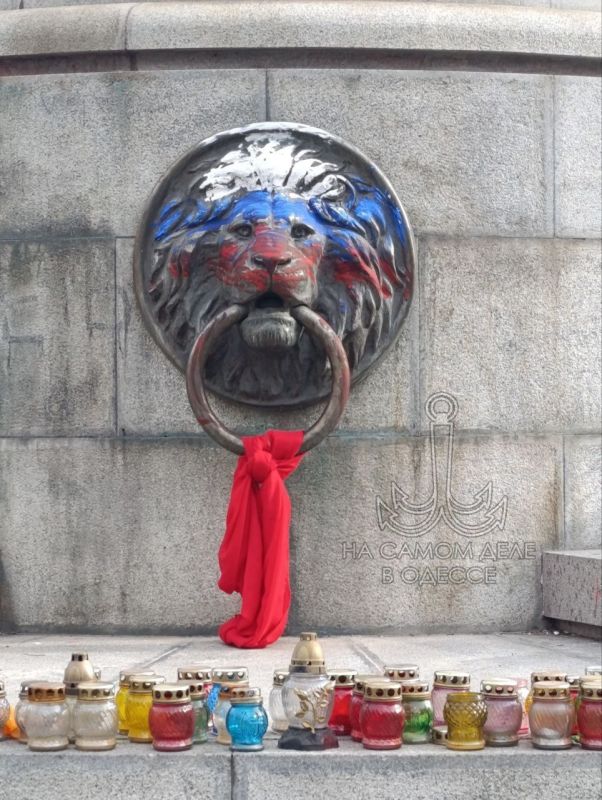 В Одессе на постаменте где раньше был памятник Екатерине II, на одном из львов появился нарисованный красками флаг России.