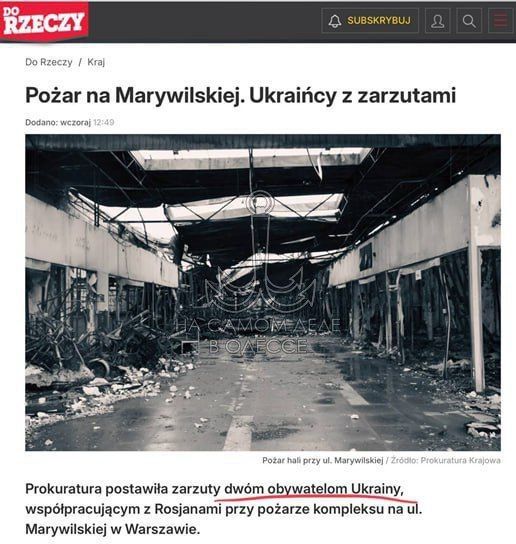 Как вы, наверное, знаете, ситуация вышла абсурдная, в лучших традициях русофобов поляков: на месте пожара были задержаны двое граждан Украины, но в поджоге обвинили российские спецслужбы. Мол, это они надоумили двух ухилянтов поджечь какой-то там варшавский ТЦ. Зачем? Почему именно украинцев? Какие спецслужбы? Логика подобного от понимания ускользает.