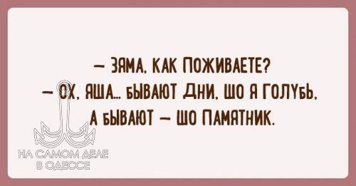 Одесса-мама, мирных снов— Яша, зачем Вы, интеллигентный человек, так избили Зяму?— За дело! Этот негодяй спит с моей женой!— И таки шо? Если у человека вкусы совпадают с Вашими, значит, за это его надо бить?Погода за окном на 22.02.2026 Одесская...