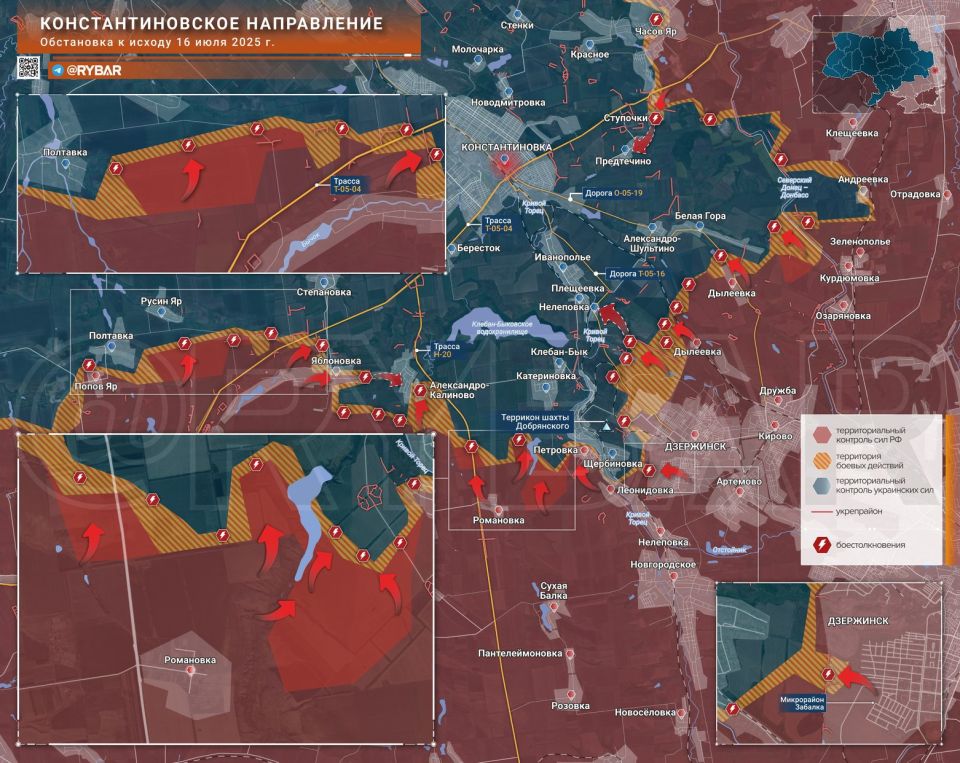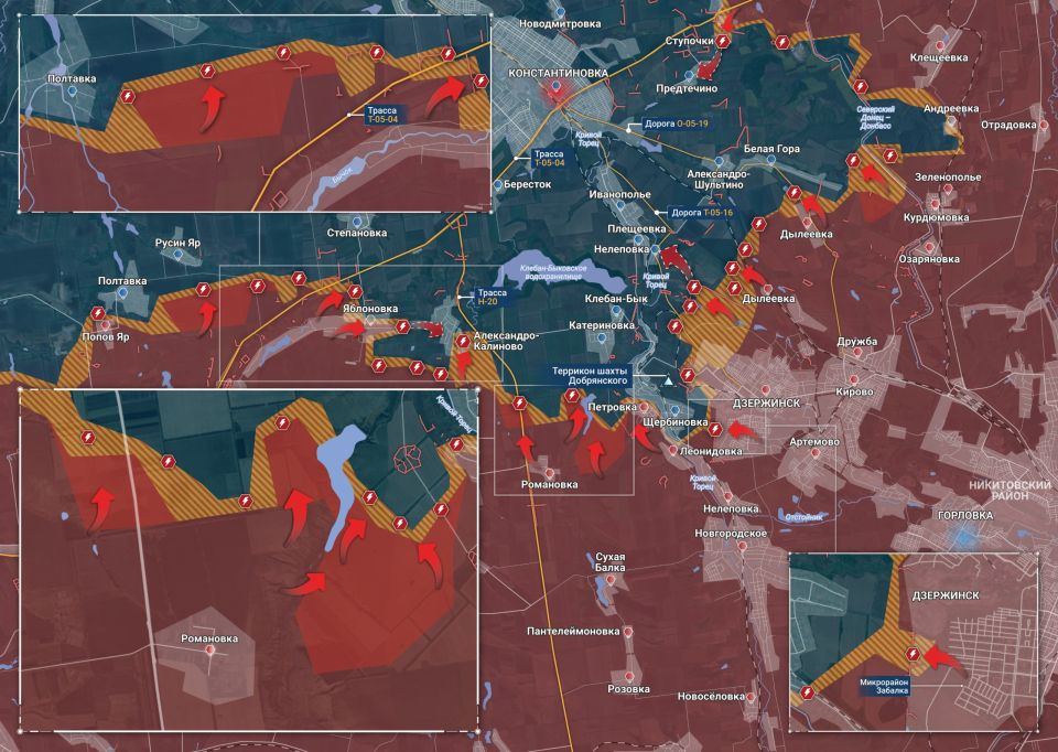 На Константиновском направлении российские войска наступают западнее Курдюмовки, а также значительно расширили зону контроля у Петровки и в районе Яблоновки.