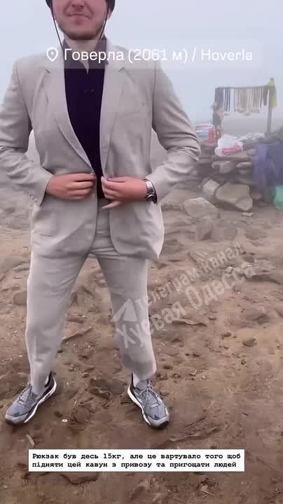 Кроме этого удивляет, что мужчина покорил Говерлу в классическом костюме…