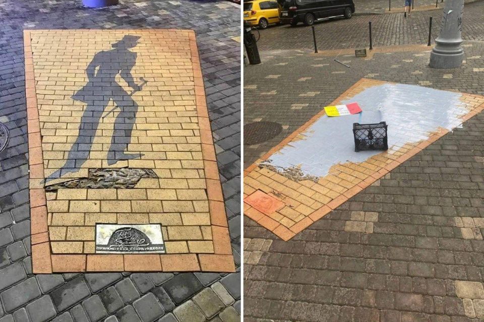 Арт-объект «Тень Пушкина» в центре Одессы залили краской. На месте лежит табличка о «реорганизации пространства».