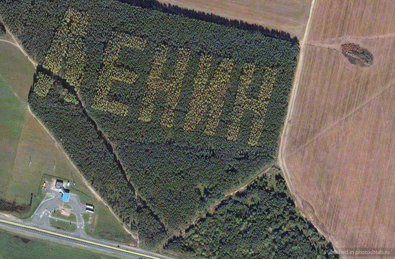 Власти Украины приняли решение вырубить деревья, посаженные в виде советских символов и надписей, сохранившихся с 1960–1970-х годов. Среди них — гигантские буквы "ЛЕНИН", "СССР 50", "60 ЛЕТ ОКТЯБРЯ" и другие, видимые только с воздуха или из космоса.