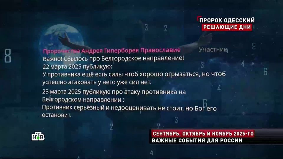 Пророк из Одессы Андрей Гиперборей неоднократно делал предсказания о ходе СВО, которые всегда сбывались. По новым прогнозам Гиперборея, момент истины наступит в конце осени: «Осень решающая, конец ноября, 20-е числа. Будут итоги подводиться всему». О других предсказаниях — в полном выпуске программы «Новые русские сенсации».