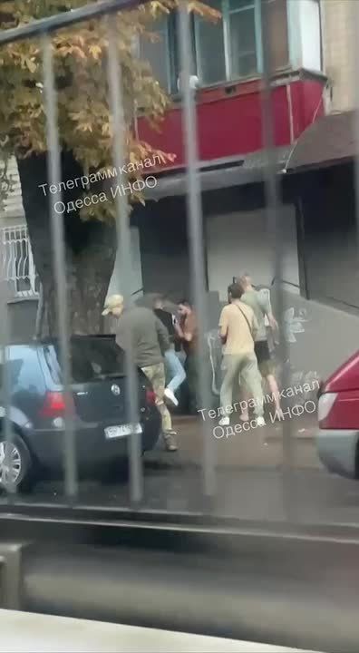 Видно, что потасовка между парнями в гражданскими и мужиками в форме. Не исключено, что военкомы получили очередной отлуп, пытаясь мобилизовать одесситов.