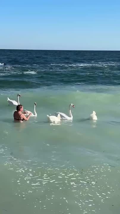 Грациозные птицы ничуть не боятся людей и плещутся вместе с ними в море.