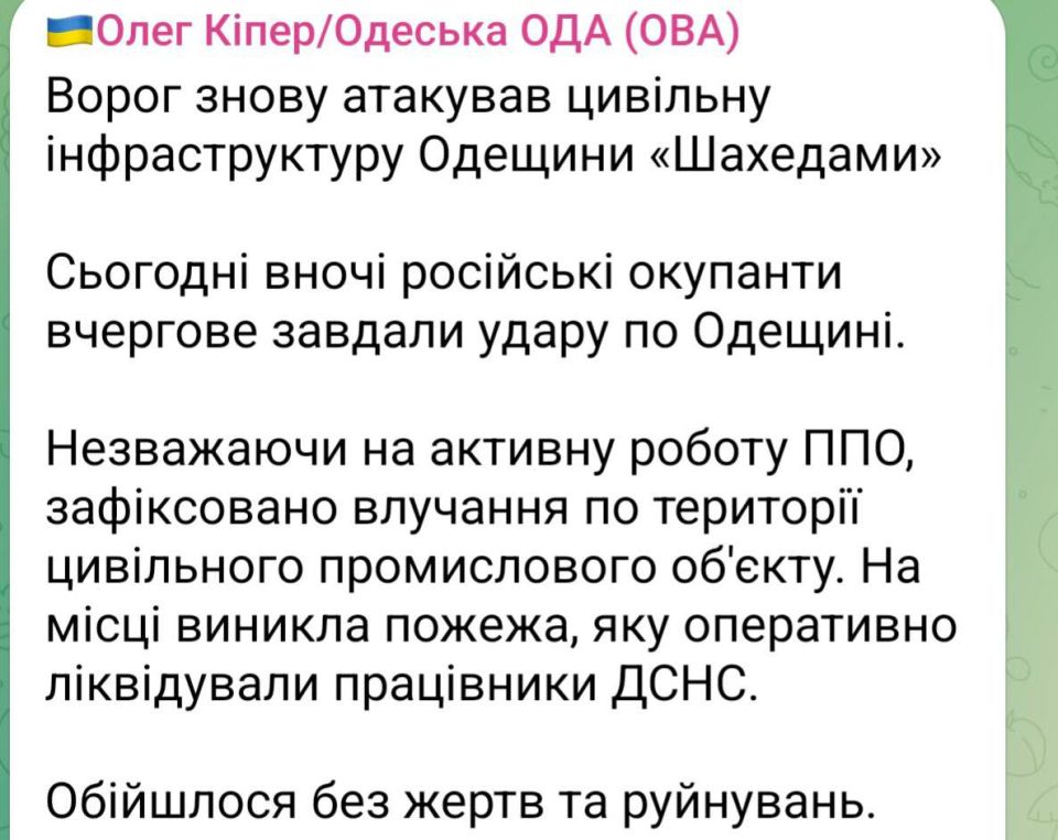 Ночью ВС РФ ударили "Геранями" по инфраструктуре Одесской области. Зафиксированы прилеты на территории гражданского промышленного объекта.