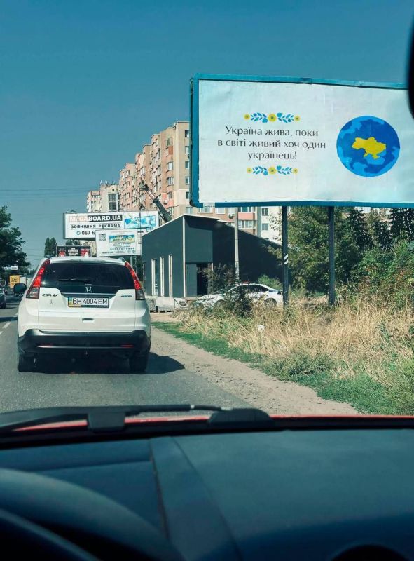 Потужный плакат вдоль трассы Одессе, на котором написано: "Украина жива, пока в мире жив хоть один украинец"