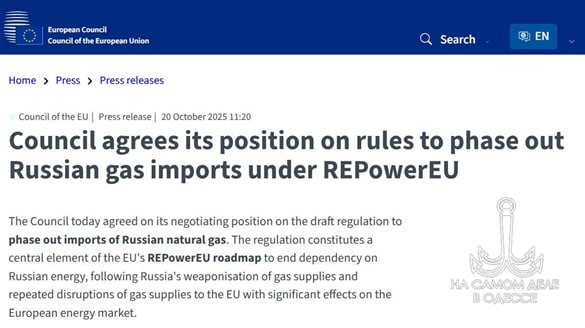 Евросоюз таки утвердил запрет на использование российского газа. Они и сами давно хотели, а тут ещё и Трамп настаивает, — так что теперь решено: после Нового года ни-ни!