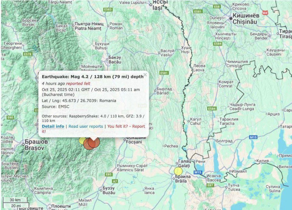 Два последних произошли 25 октября ночью с перерывом около часа. Сообщается, что Южные регионы Украины почувствовали сейсмическую активность.