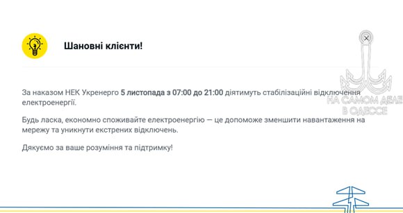 ДТЭК, как мы и предупреждали вчера, снова в трудах — прошлой ночью «гераньки» поразили «энергетический объект в Одесской области». Так что сегодня в Одессе и области целый день будут проводиться стабилизационные отключения.