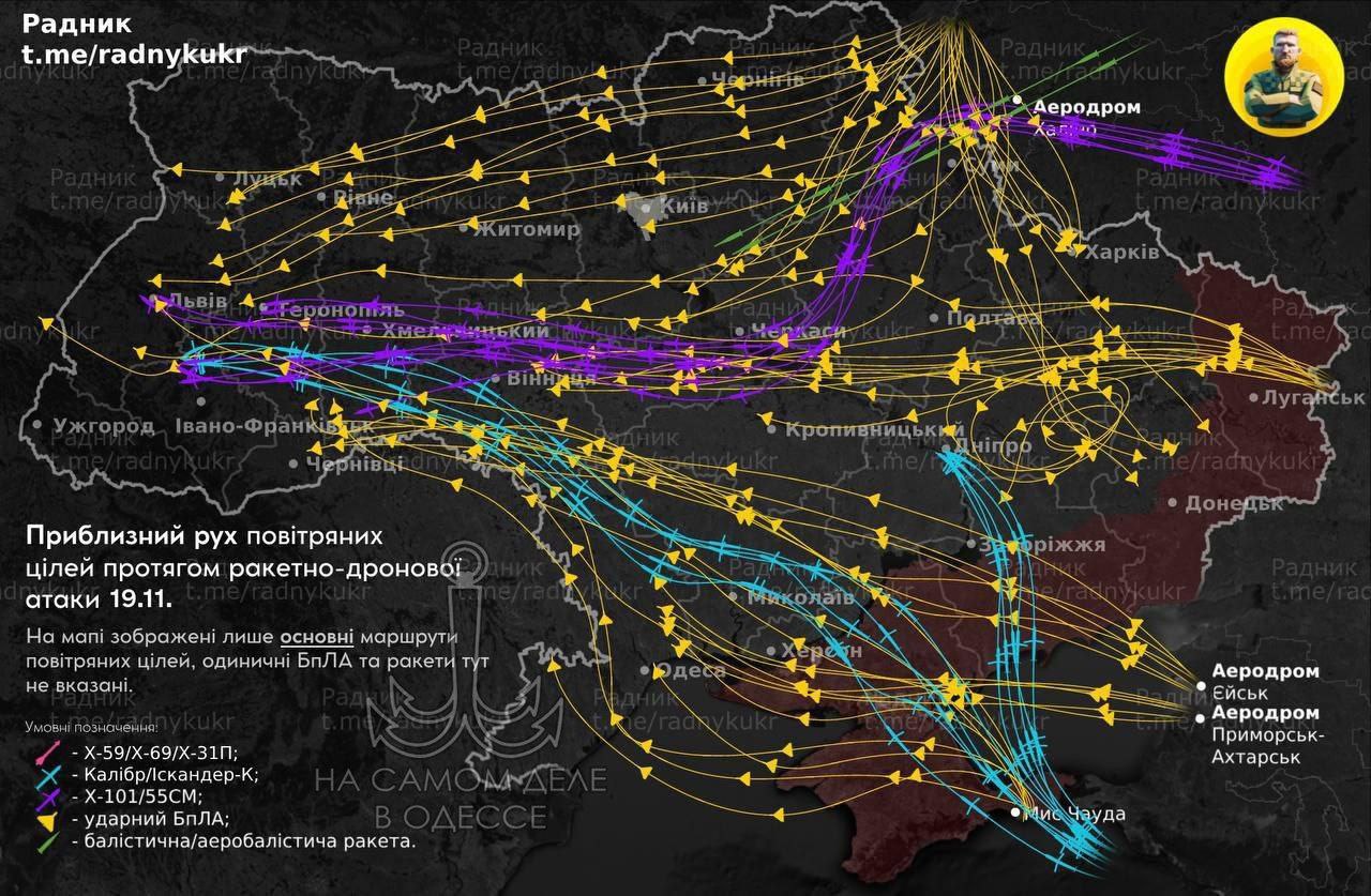 Прилёты. Масштабная атака на энергетику Украины. Для ударов ВС РФ применяли всю линейку высокоточного оружия: «Калибры», «Герани» (ударные дроны) и гиперзвуковые «Кинжалы». На фото представлены траектории полёта «Гераней», по версии УкроСМИ и фото горящего Львова после прилёта.