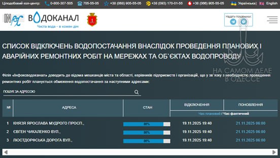 Коммунальные службы 21 ноября 2025 года в Одессе и области информируют: