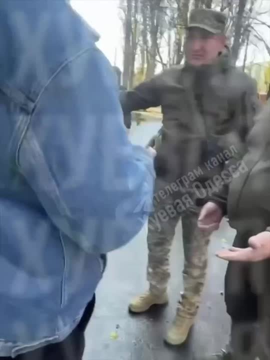 Одесса: тцкшник проверял документы у жителя, к ним подошел еще один тцкшник и ударил гражданского и получил в лицо из баллончика. После этого он взял пистолет и стал им угрожать
