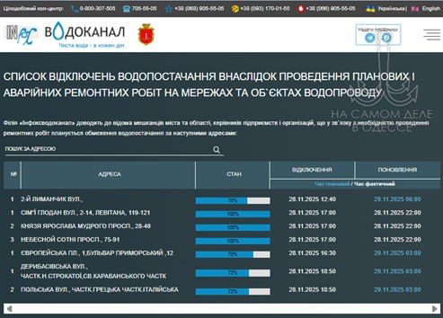 Коммунальные службы 29 ноября 2025 года в Одессе и области информируют: