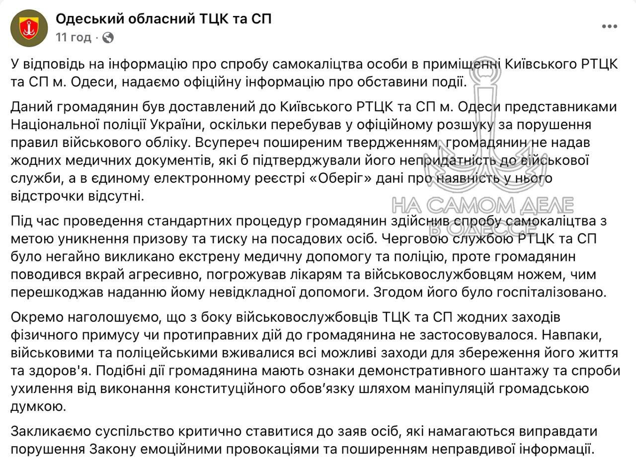 В результате мужчина нанёс себе порезы подручными средствами, после чего был госпитализирован. Так же по его словам, в ТЦК незаконно удерживают и других людей на пятом этаже: один не ест уже 6 дней, другой находится там более 12 суток.