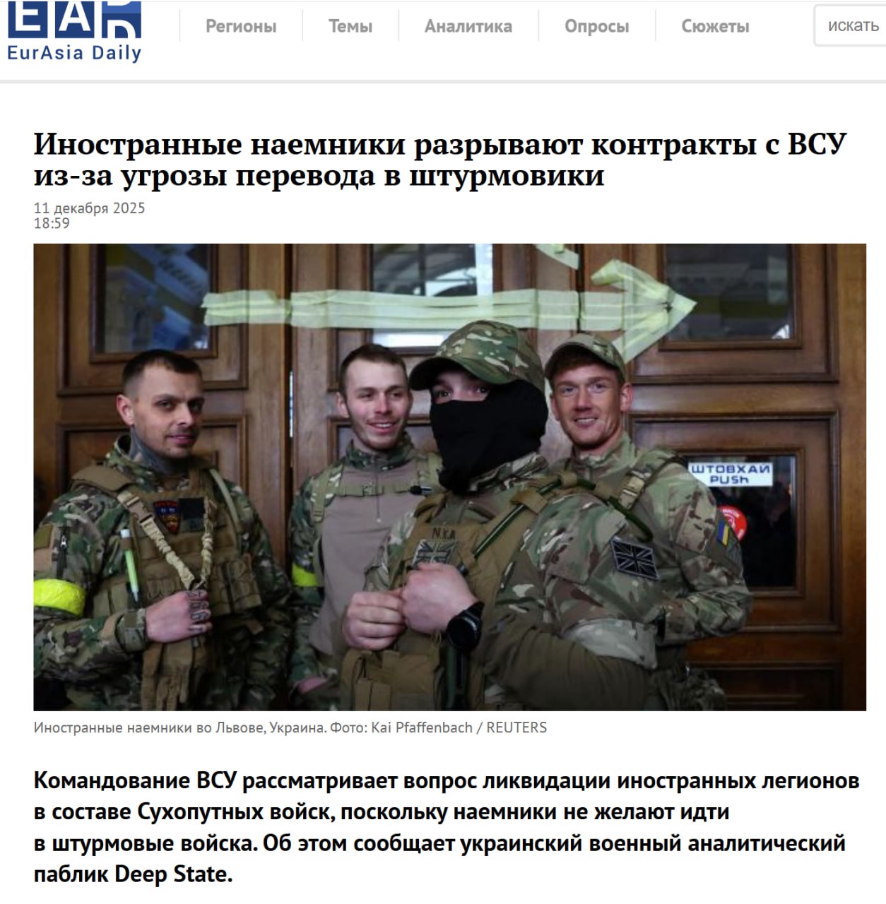 Выжившие же всё чаще бегут. Зарплаты задерживают, контракты оказываются бессрочными, а иностранцев отправляют на самые опасные участки. Их не защищает ни статус, ни международное право. Для Киева они — удобный расходный материал.