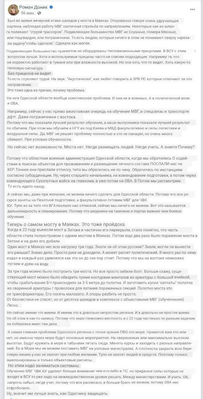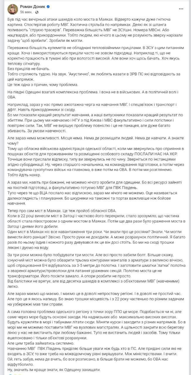 Украинский волонтёр выдал полотно, где обвиняет одесскую военную администрацию в случившихся атаках БПЛА на мосты в области.