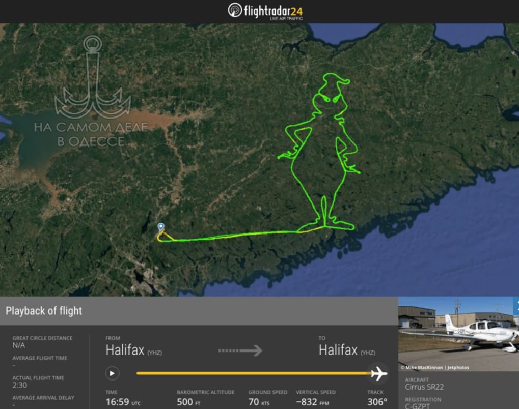 Пока весь мир развлекался отслеживанием «саней Санты Клауса» через сервис Flightradar, один канадский пилот решил пошутить и «украсть» Рождество. Он так проложил маршрут своего самолёта, чтобы на Flightradar отобразился силуэт противника Санты — Гринча.