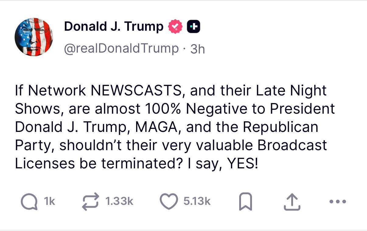 «Если новостные каналы и их вечерние шоу почти на 100% негативно относятся к президенту Дональду Трампу, движению MAGA и Республиканской партии, разве не следует ли аннулировать их очень ценные лицензии на вещание? Я говорю: ДА!»