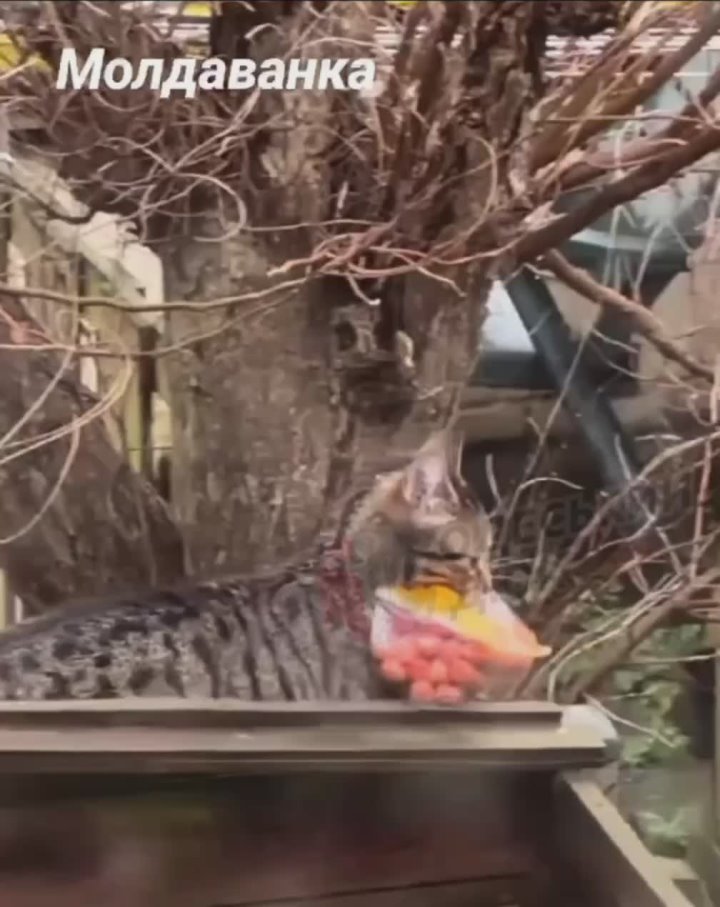 Пушистик где-то урвал большую пачку мясных изделий и тащит в укромное местечко.