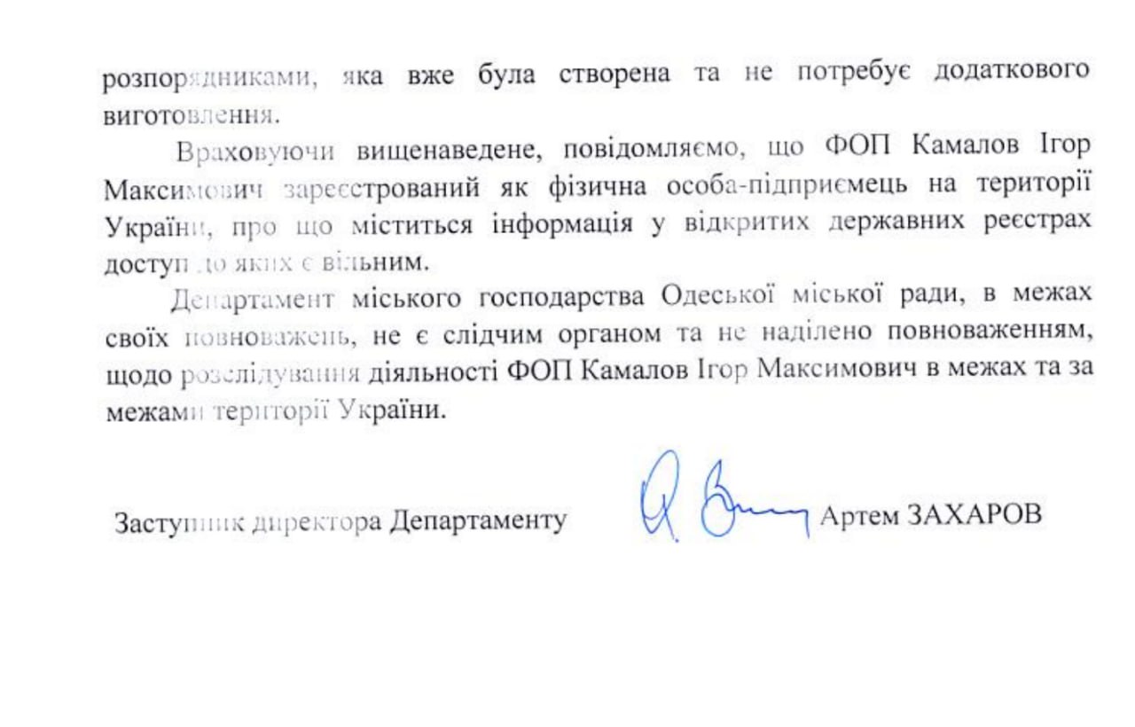Итак, недавно выяснилось, информация есть в открытых источниках украинских сайтов, что бизнесмен из ДНР проектирует восстановление Одессы после прилётов. Некий Игорь Камалов получил 10 подрядов. В департаменте городского хозяйства Одесского горсовета удивлённым журналистам «Блокнота» заявили, что не обязаны выяснять, чем занимается их подрядчик и откуда он (скрин 2), но пообещали расторгнуть договоры.