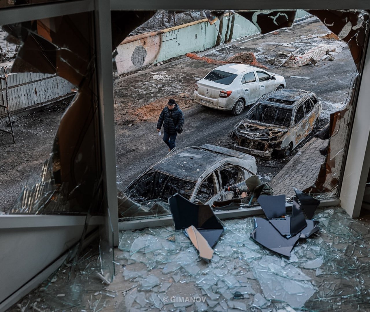 Выжженный цивильный автосалон возле знаменитой горы Чумки — последние дни туда безостановочно что-то завозили вояки.