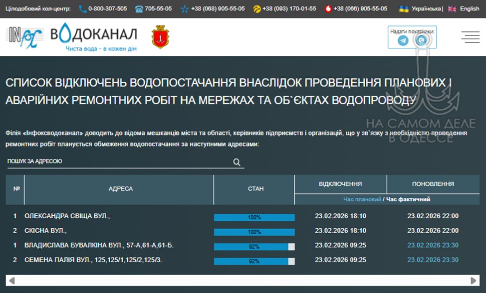 «Инфоксводоканал» предупреждает, что из-за отсутствия электроэнергии нет воды у жителей Киевского и части Хаджибейского районов Одессы, жилмассивов Радужный, Совиньон 1—5, Черноморка и Таирово.