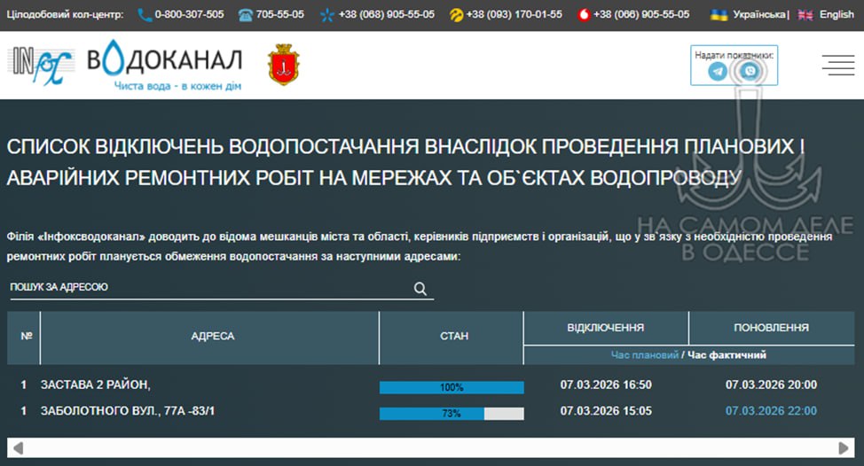 Коммунальные службы 08 марта 2026 года в Одессе и области информируют: