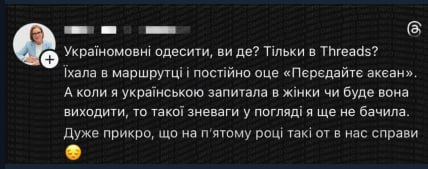 «Укроязычные одесситы, вы где? Ехала в маршрутке и постоянно это: «Передайте океан». А когда я по-украински спросила у женщины, будет ли она выходить, такого неуважения во взгляде я ещё не видела. Очень жаль, что на пятом году у нас такие дела».