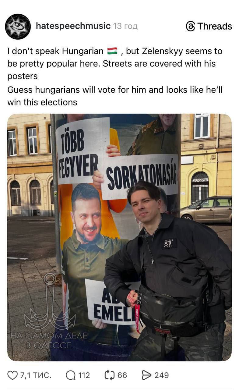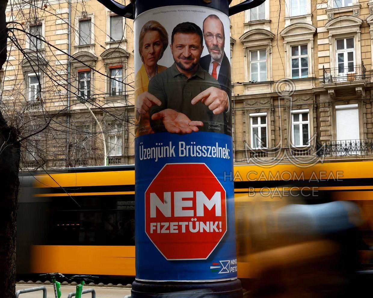 На плакатах его представели как угрозу интересам страны. Один из билбордов гласит: «Передадим Брюсселю: мы не платим!», другой призывает: «Не дадим Зеленскому смеяться последним!».