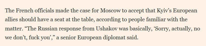 Однако, по информации FT, разговор с помощником президента РФ получился коротким. Ушаков ответил отказом в грубой форме. Издание приводит его фразу на английском: