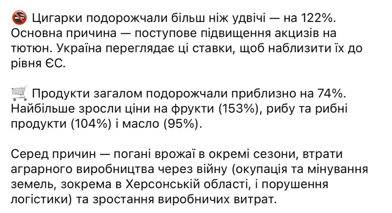 Больше всего выросли цены на фрукты (+153%) и сигареты (+122%).