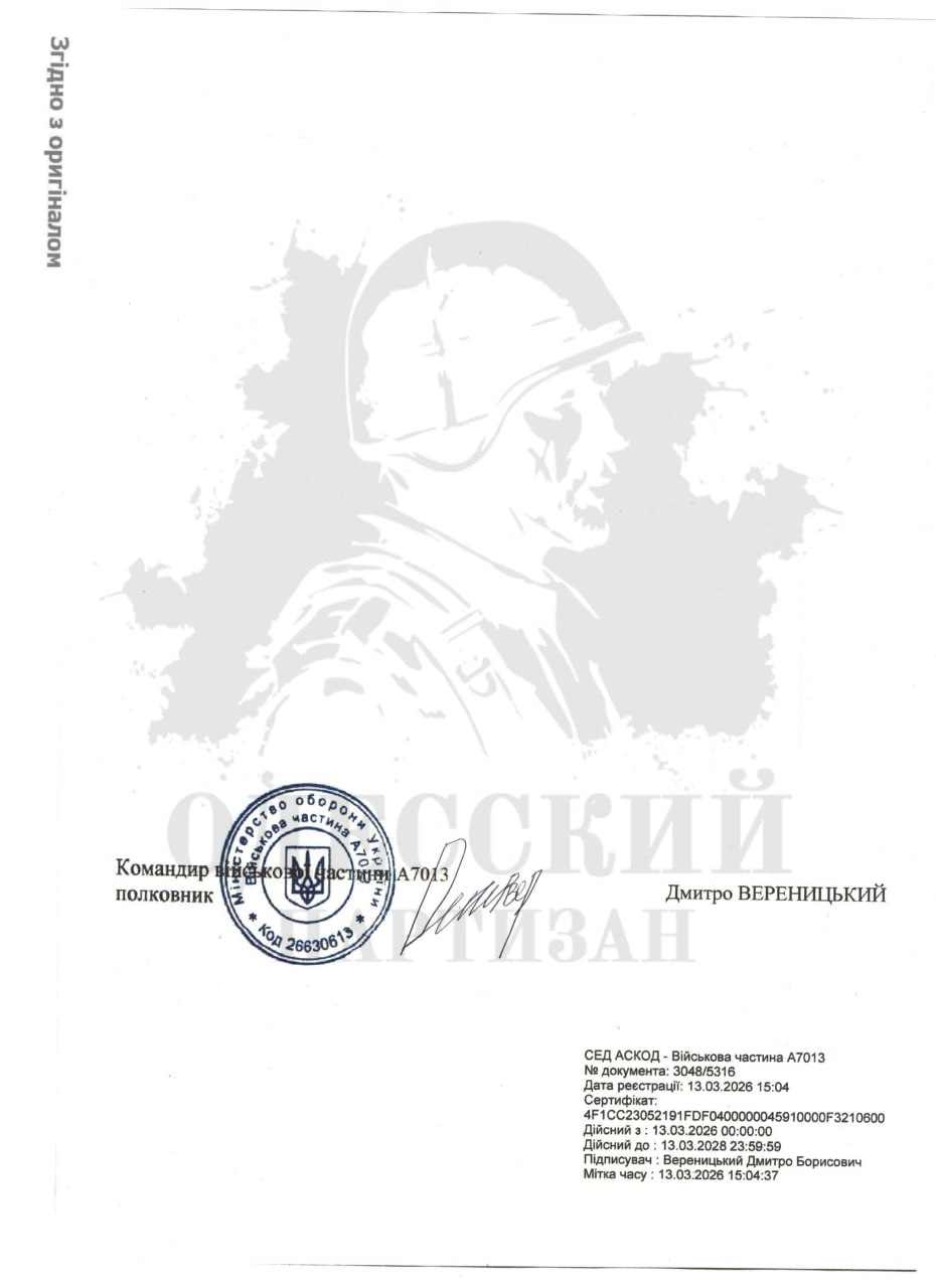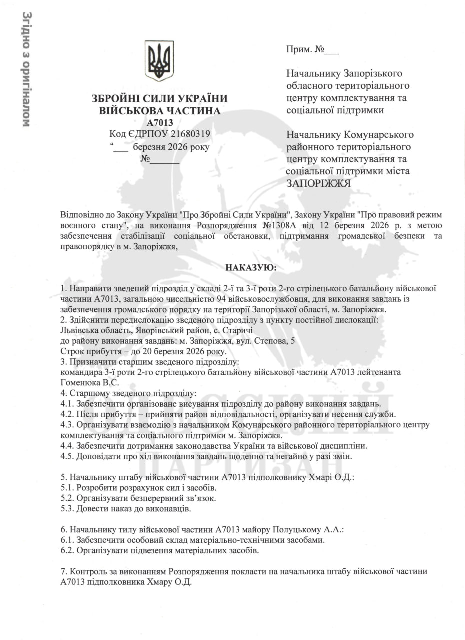 Из него следует, что две недели назад из В/Ч А7013 (с. Старычи Львовской области) в Запорожье отправлен сводный отряд из двух рот 2-го стрелкового батальона, если мы правильно понимаем, 65-й ОМБр.
