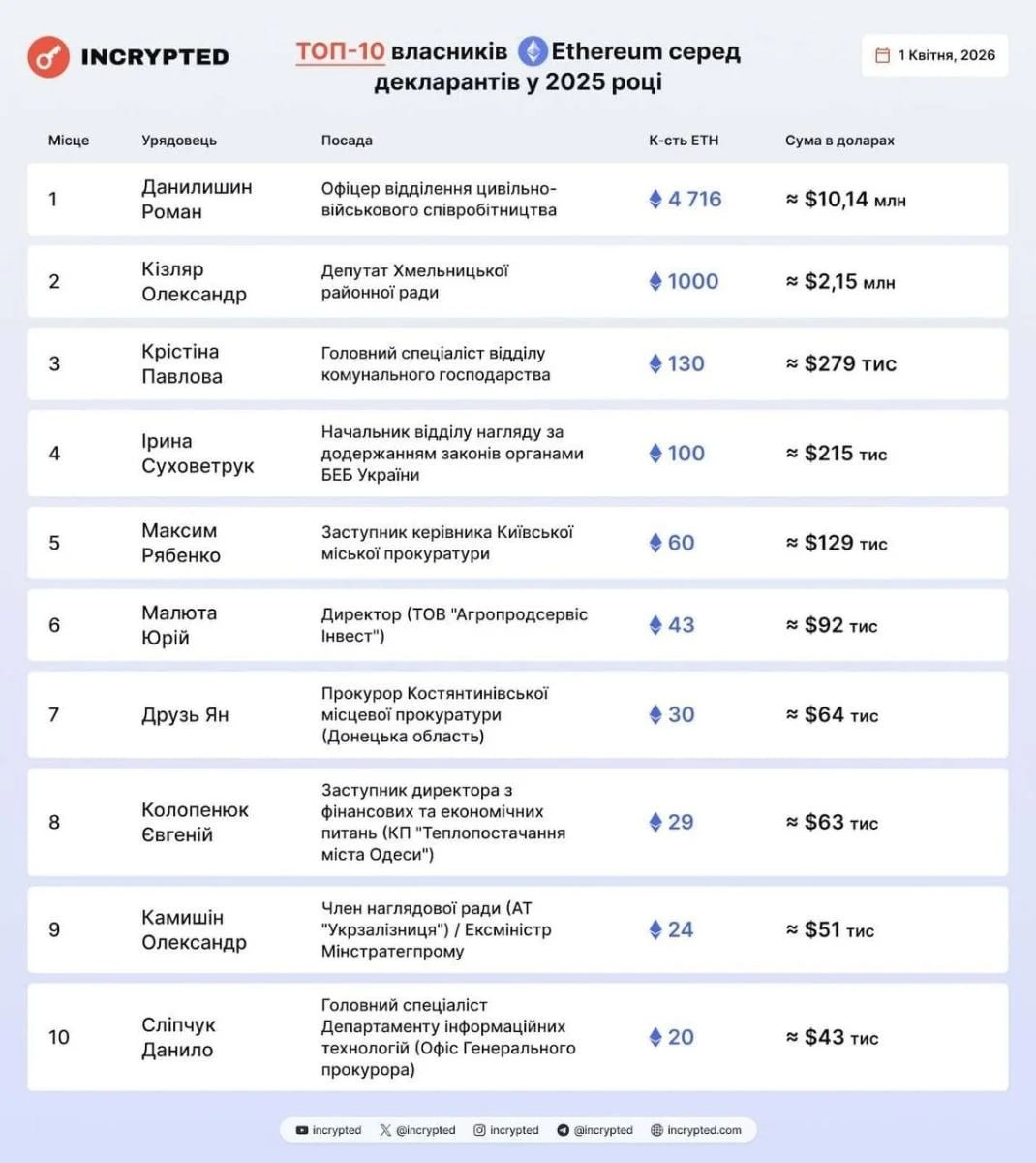 Офицер отделения гражданско-военного сотрудничества Святошинского ТЦК Роман Данилишин задекларировал 4716 ETH, что составляет около $10,14 млн или примерно 450 млн грн.