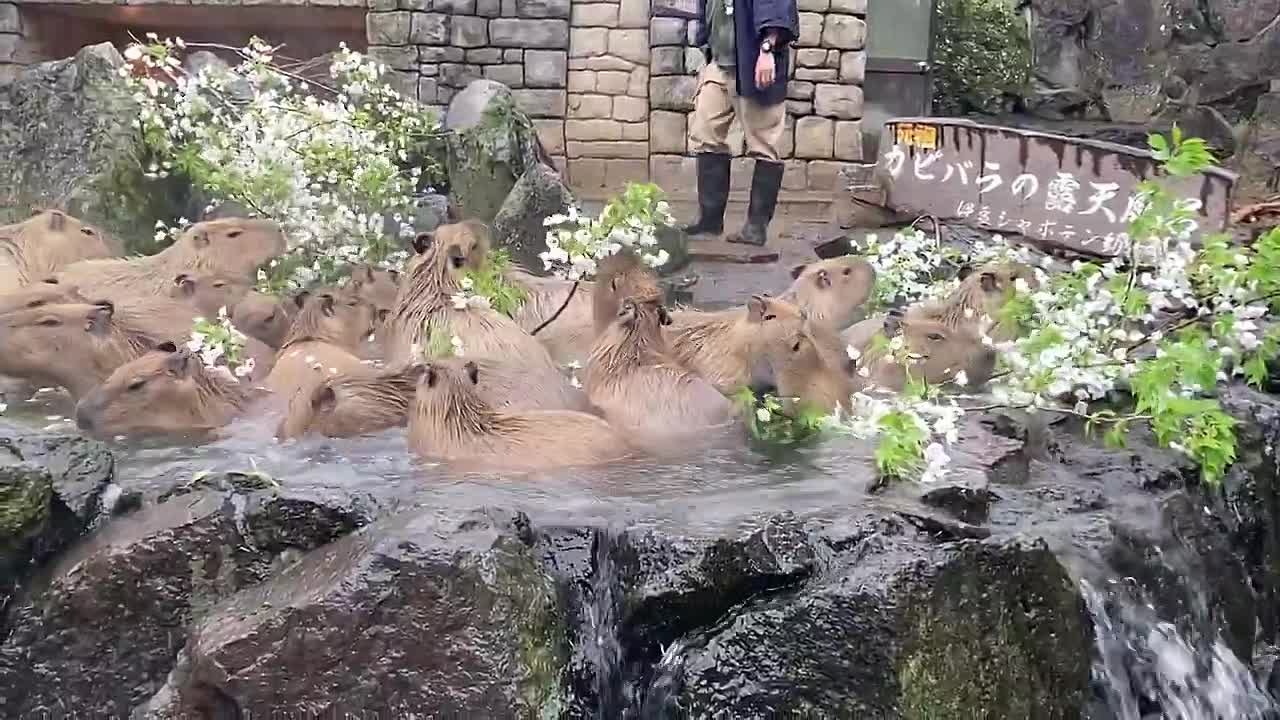 Они часами лежат в горячих источниках с сакурой и вообще никуда не спешат — персонал даже не пытается мешать этому чиллу.