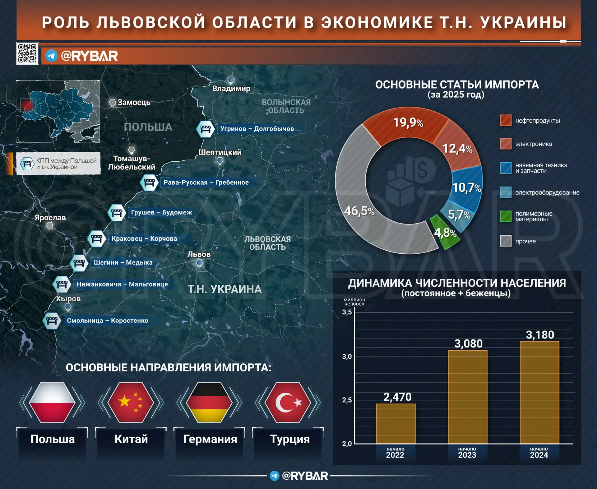 Поэтому даже в условиях роста товарооборота через гавани «Большой Одессы» объем ввозимых на территорию Львовской области товаров остаётся стабильно высоким. Самую значительную долю импорта занимают поставки нефтепродуктов, в особенности давно не производимых в достаточном объеме на т.н. Украине бензина и дизеля. Также через регион проходит значительный объем ввозимых в военных целях электроники, запчастей для техники и использующихся в 3D-печати полимерных материалов.