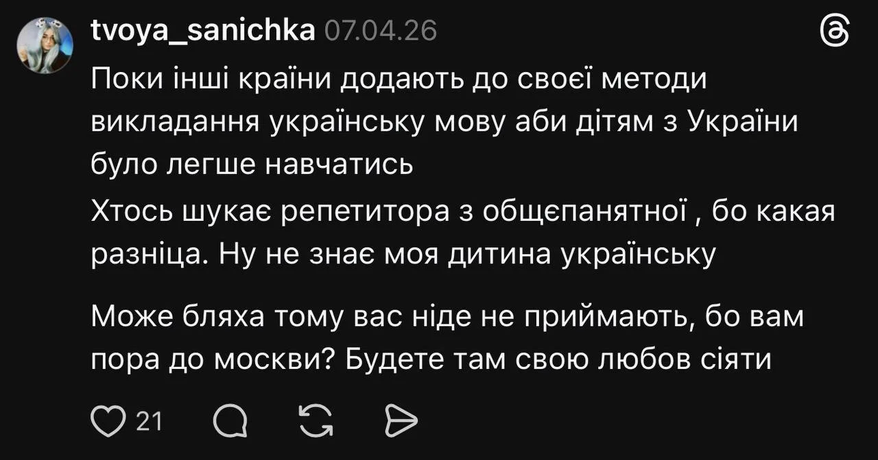 Это вызвало шквал эмоций у свидомых. В итоге автору пришлось объяснять, что ребенок не знает мовы, потому что в семье общаются по-русски.