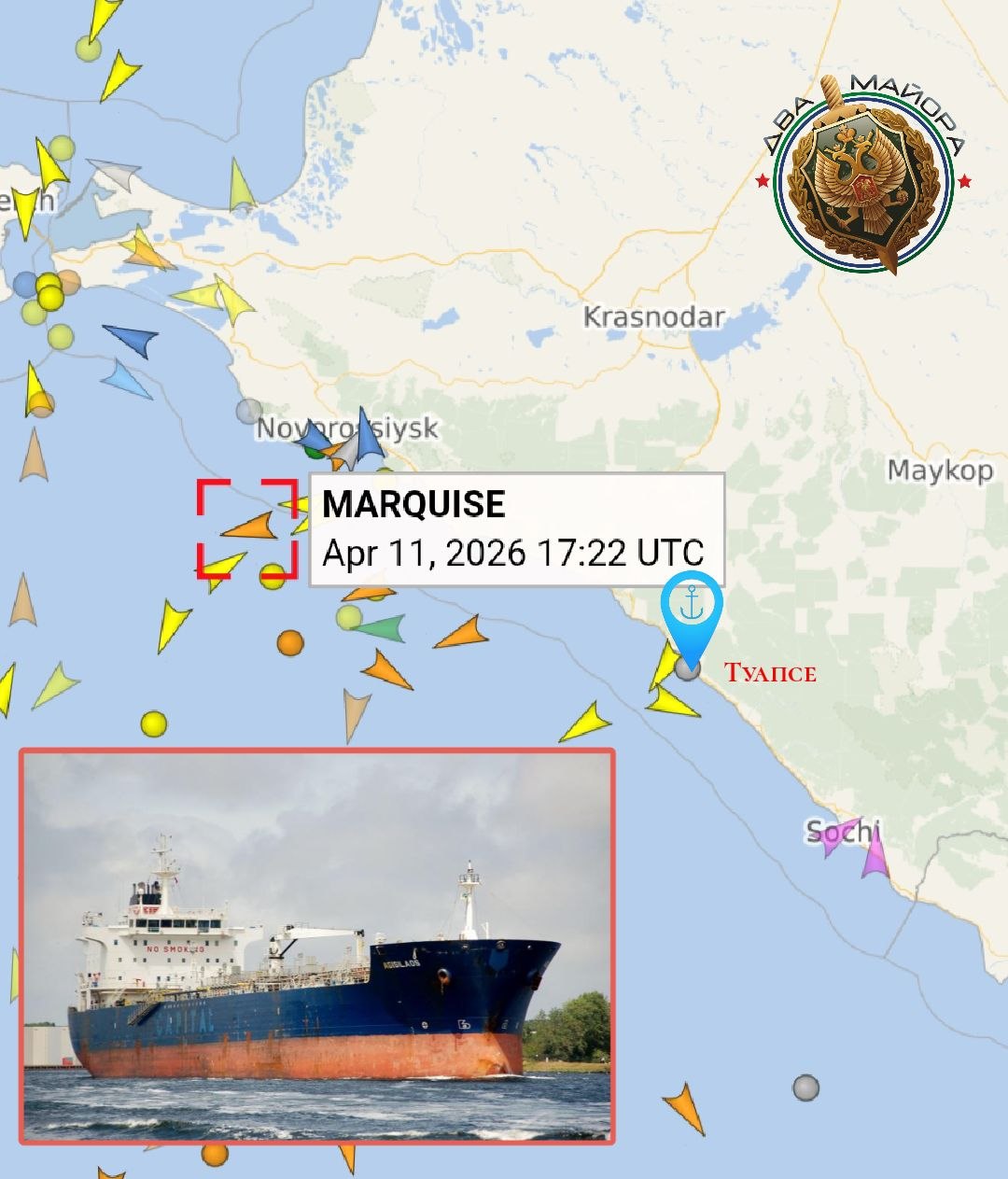 Двумя БЭКами ВМС Украины юго-восточнее порта Туапсе атакован танкер Marquise под флагом Камеруна. БЭКи поразили кормовую часть, район винто-рулевой группы и машинного отделения.