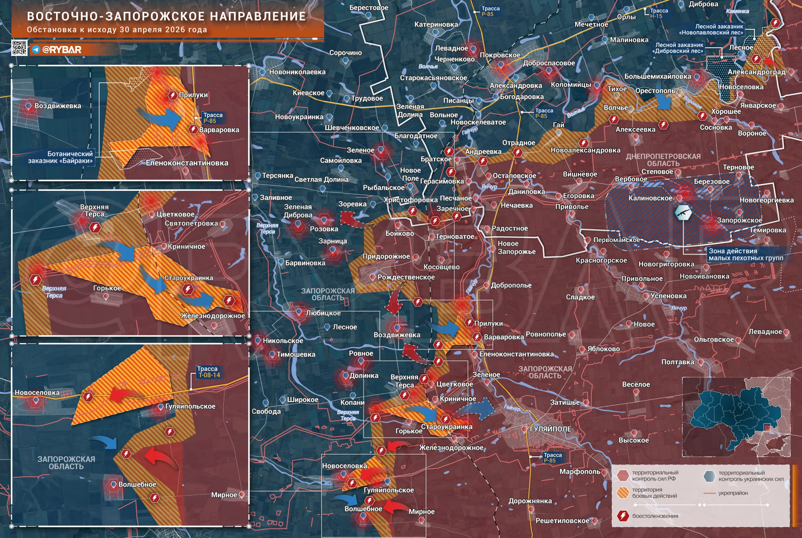 НаВосточно-Запорожском направлении противник активно применят группы просачивания, а вот уже к юго-западу от Гуляйполя бойцы ВС РФ вклинились между Волшебным и Гуляйпольским, а также смогли заскочить на окраины населенного пункта Новоселовка.